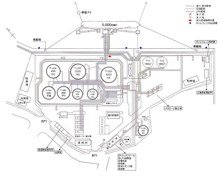 4.受入設備 | 5,000D/Wドルフィン(石油・LPG共用)1バース 受入附帯設備 オイルフェンス・巻取機 1式 桟橋ユニッククレーン設備 2基 石油受入ホース 1式 LPGマリンローディングアーム 1式 作業船 1隻 |